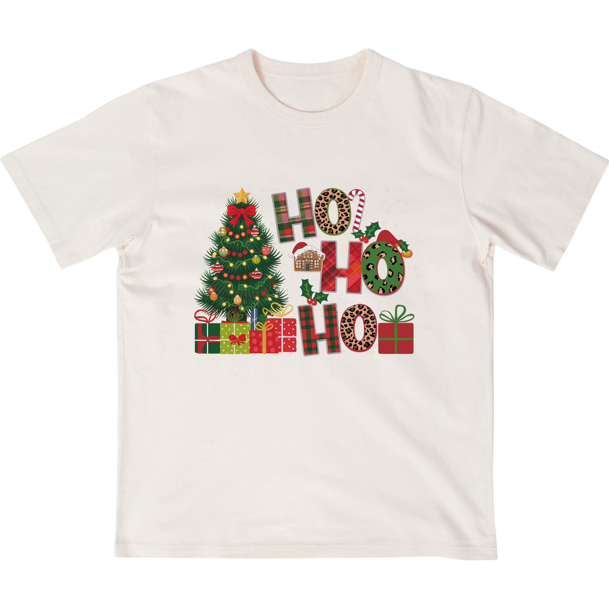 This festive T-shirt features a playful design of a "Ho ho ho" tree surrounded by presents. Perfect for spreading holiday cheer and bringing a smile to everyone's face. (Tis' the season for puns and word play!)