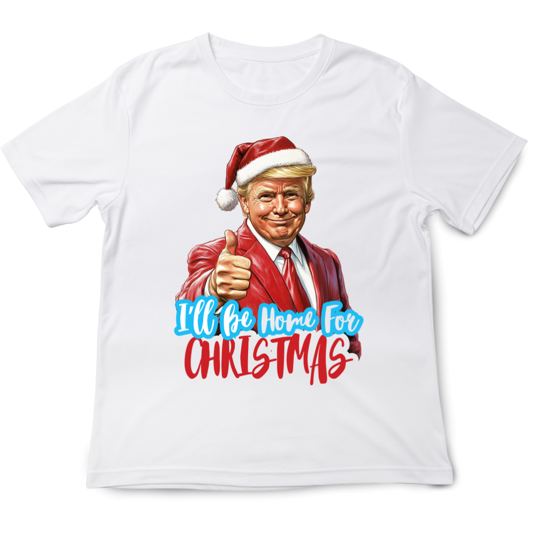 Celebrate the holiday season in style with this festive "Trump - I'll be home for Christmas" T-shirt. Made with excellent quality for long-lasting wear and a comfortable fit, this shirt is perfect for spreading holiday cheer or giving as a gift. Get yours now and join in on the holiday fun!
