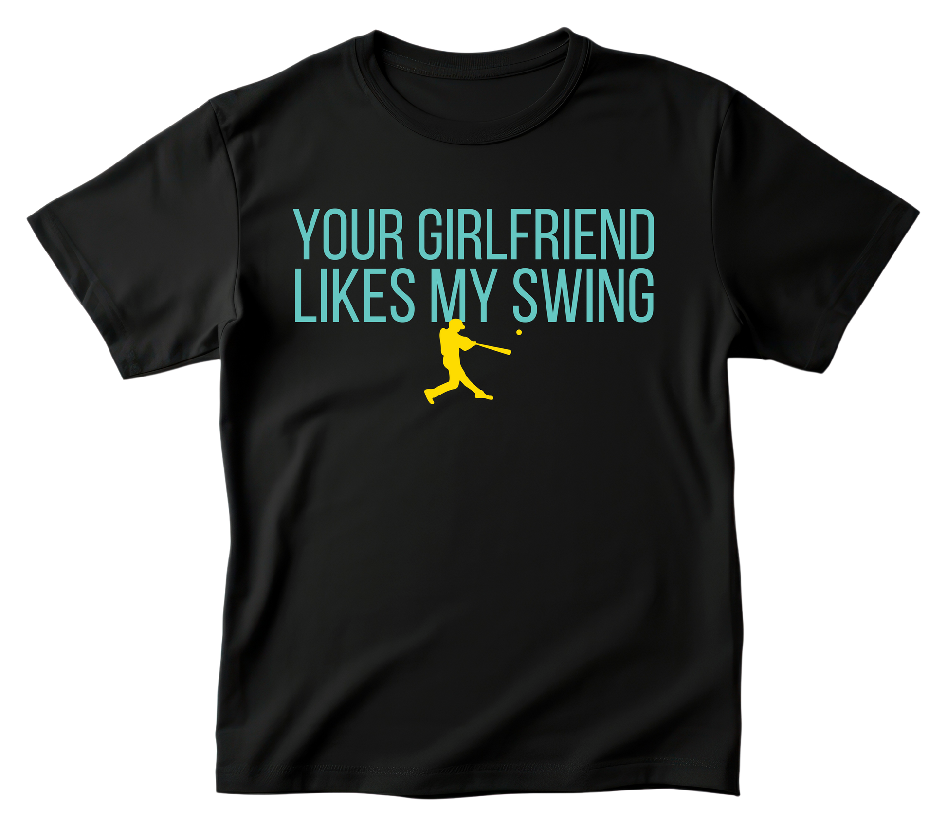 Elevate your style game with our Your Girlfriend Likes My Swing T-Shirt in black with yellow accents. Made with excellent quality and fit, this fun baseball t-shirt is perfect for both youth and adults. Whether as a gift or for yourself, step up to the plate and swing in style.